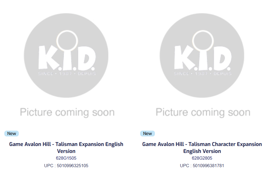 Whilst I was having a look around the internet at various distributors and game shops for errant listings, I came across these from KID Toy for a “new” Talisman Expansion (which is Talisman Nemesis: Call of the Hunt!) and very interestingly a second listing for a Talisman Character Expansion!