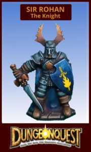 The Games Workshop release of DungeonQuest included 4 plastic miniatures. The expansion Heroes for DungeonQuest includes 12 metal Citadel Miniatures and character cards for each and new cards and tokens for the base game.