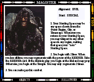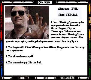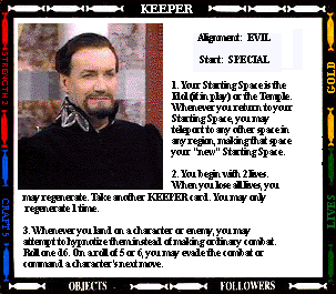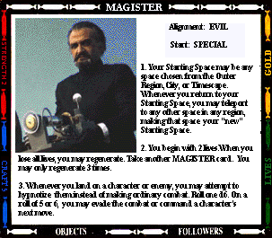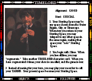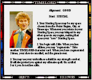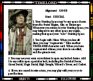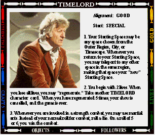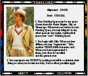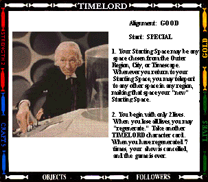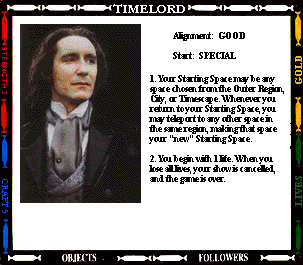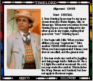 Start: SENTINEL OUTPOST STR- (0) CRAFT- (+2) 1. Your mind joins with all previous Presidents of the High Council of Timelords. Gain 2 craft. You also gain 4 lives. If you regenerate, you lose the title of Lord President. 2. You always have a spell. 3. While you are Lord President, you cannot be tried, judged, taxed, imprisoned, or enslaved. 4. Instead of making an attack, you may offer the "gift of Rassillon" to any character you land on. Send them to the Rad Zone and Command their next move. |