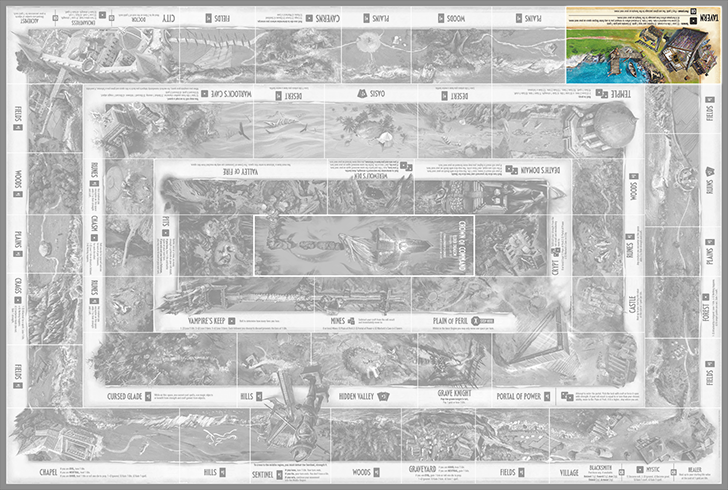 1) Lose 1 life in a brawl. 2) Gamble and lose 1 gold. 3) Gamble and gain 1 gold. 4) Listen to a minstrel’s tale. Gain 1 fate. 5) A wizard offers to teleport you to any Outer Region space as your next move. 6) A ferryman offers free passage to the Temple as your next move.